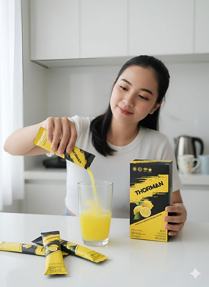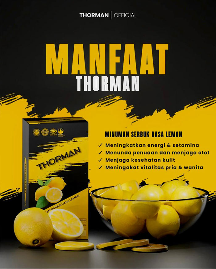 Thorman adalah minuman serbuk rasa lemon yang diformulasikan khusus untuk membantu meningkatkan stamina, vitalitas, dan gairah pria. Terbuat dari bahan-bahan herbal pilihan seperti guarana, tribulus, cordyceps, ginseng, pasak bumi, dan lemon, Thorman memberikan manfaat alami tanpa efek samping berbahaya. Kombinasi bahan-bahan ini telah dikenal secara tradisional untuk mendukung energi dan performa pria, menjadikan Thorman solusi yang aman dan efektif untuk mendukung aktivitas harian Anda. Rasakan manfaat alami dan segarkan hari Anda dengan Thorman!